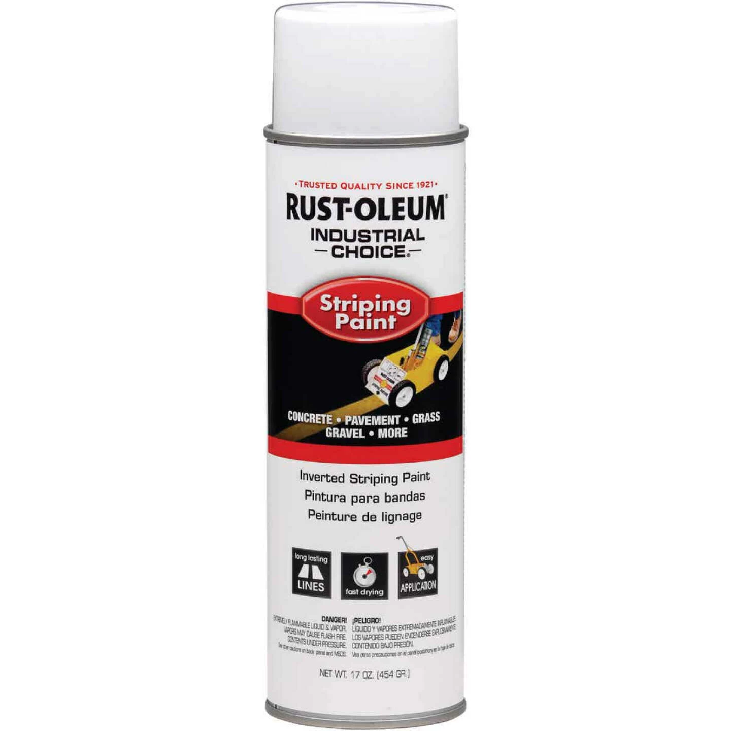 A lead-free aerosol striping paint designed for use in an inverted position. Features weather and abrasion resistance for durability. When used with the Rust-Oleum Striping Machine, these coatings are ideal for striping parking lots, and aisles. They feature fast dry and adhesion to concrete, blacktop, gravel, and grass. 17 oz. fill covers approximately 30 sq. ft.