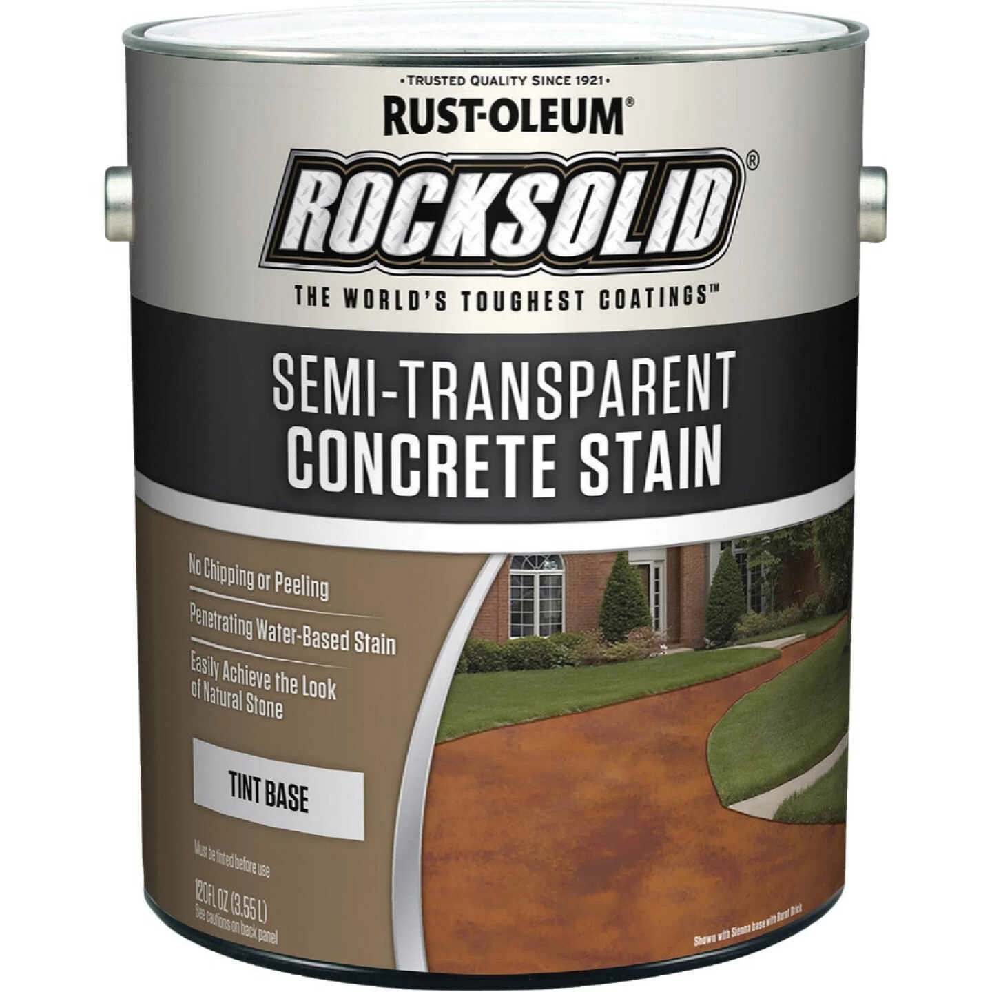 Rust-Oleum RockSolid Semi-Transparent Concrete Stain creates the marbleized look of acid-stained concrete. Water-based formula gives ordinary concrete a unique finish that is both rugged and trendy. No chipping or peeling. Coverage area: 250 to 400 Sq. Ft. for bare or smooth, 175 to 200 Sq. Ft. for rough or porous concrete. Customize the tint base to the color of your choice.