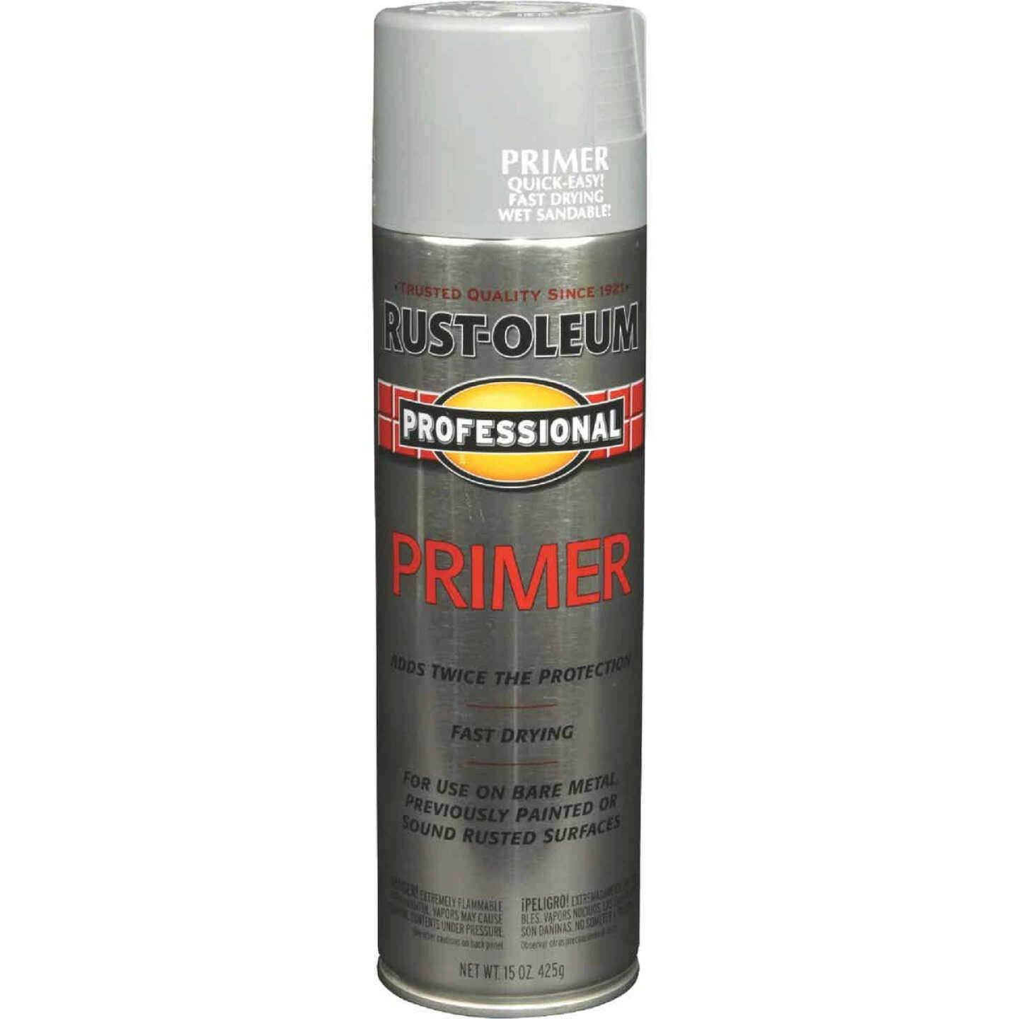 Rust-Oleum professional primer spray provides twice the protection of enamels alone. Apply to metal, wood, concrete, and masonry in heavy-duty and commercial environments. Projects against the elements. Product features: Fast-drying, indoor/outdoor, durable, corrosion-resistant. 15 oz. aerosol can covers approximately 30 sq. ft.