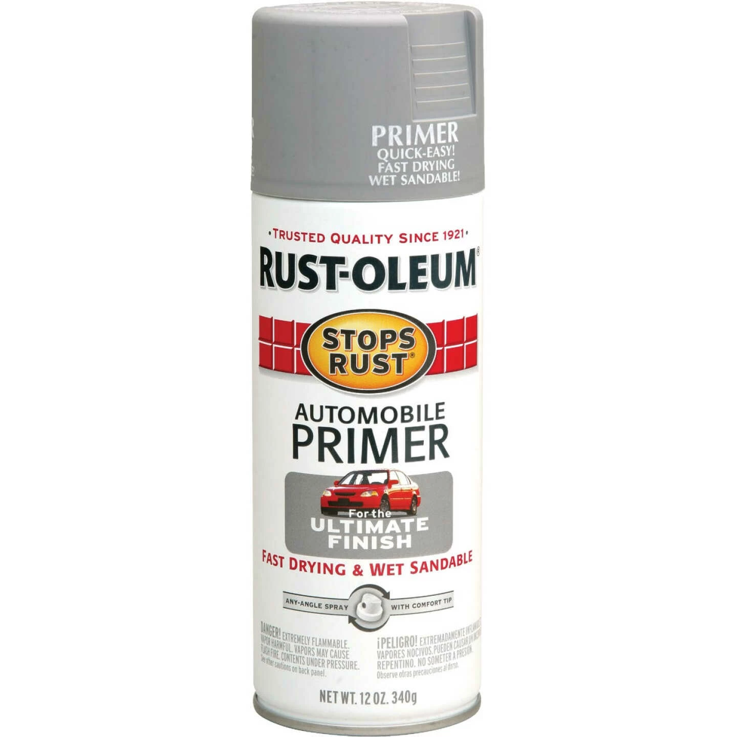 Rust-Oleum Stops Rust Automotive Primer Spray has a fast-drying, rust-preventative formula. Suitable for use on a variety of materials except galvanized metals, this primer spray has both indoor and outdoor durability. Featuring a red color, this primer spray works well under most automotive paints. To use, spray on and wait 15 minutes before applying a top coat or wet sand to achieve an ultra-smooth finish.