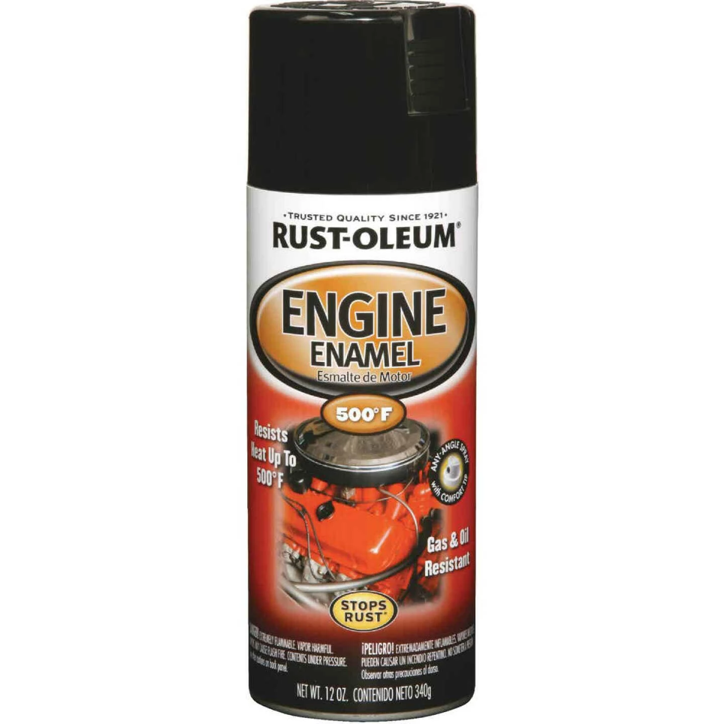 Rust-Oleum engine enamel creates a smooth finish and is formulated for use on automotive engines and other automotive surfaces which reach intermittent temperatures up to 500 deg. F. (260 deg. C.). Product features: Resists heat up to 500 deg. F., gas and oil-resistant, Stops Rust formula, any-angle spray with comfort tip. 12 oz. spray can covers approximately 25 sq. ft.